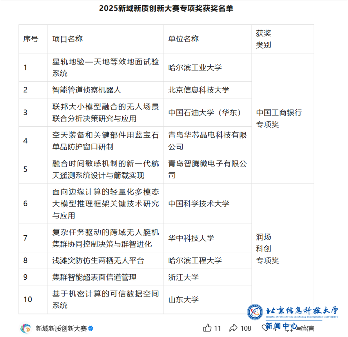 作为北京市属高校中唯一参赛并获奖的高校,学校将以2025新域新质创新大赛为契机,加强顶层规划、政策措施、重大任务、资源平台等方面的统筹,集聚学校优势科研领域的强大合力,夯实新域新质发展基础,充分发挥信息特色、行业特色,推动科技创新和产业创新融合,健全先进技术的转化机制,为培育新质生产力、塑造发展新动能注入强劲动力。(供稿:先进院 徐梅 图片:徐梅 新域新质大赛官网 编辑/审核:郭辉)
